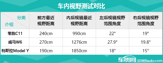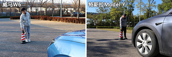 在数据测试环节,我们针对车辆日常使用过程中最常用到的视野范围进行了测量和比对。在正前方视野盲区测试环节中,我们采用高70cm的桩桶作为参照物,随后调整车辆相对位置,直至在主驾席可以看到桩桶上沿。 实测过程中,三款车型的前方视野距离实测数据都比较优秀,作为中型SUV,前方的视野盲区范围其实都并不算大。对比来看,特斯拉Model Y的实测表现最优,前方视野盲区距离仅为190cm,在测试过的同级别车型中属于上游水平;零跑C11成绩次之,距离为240cm。相比之下,威马W6的测试成绩不及另外两款车型,但在测试过的同级别车型中也处于中上游水平。