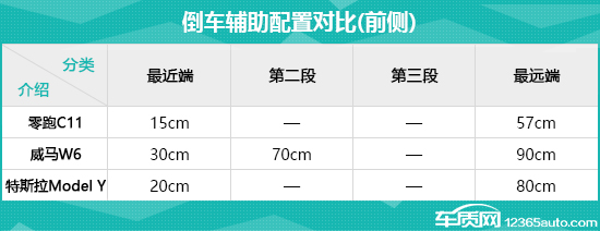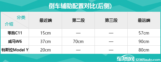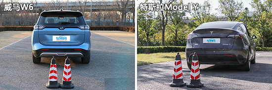 配置方面,三款车型均配备了前、后驻车雷达,整体配置表现令人满意。参考往期测试经验,持续蜂鸣阶段越接近25cm则越贴近日常使用习惯。测试成绩方面,三款车型的整体表现略有差距。前雷达方面,威马W6探测距离最远,可在90cm处感应物体,表现优于另外两款车型。三款车型在雷达持续蜂鸣阶段的距离均与测试经验值有所偏差,其中,威马W6和特斯拉Model Y的表现相对要更好一些,雷达最近提示距离均为20cm,而零跑C11的最近距离不是非常合理,仅有15cm,预留安全值较低。 后驻车雷达部分,同样是威马W6的探测距离最远,虽然90cm的成绩也不算理想,但是相比另外两款车型还是具备一定优势。总体来看,三款车型的后侧雷达探测距离均与日常使用习惯有所差异,相比之下,特斯拉Model Y的最近距离为20cm,表现略好一些。
