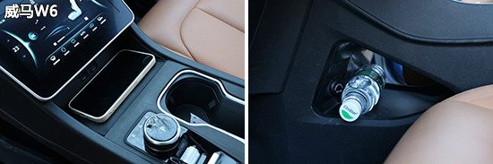 威马W6全车共提供12个储物空间(除杯架外),前排储物空间数量较多,前门板储物格采用贯通式设计,并提供了独立的水杯槽,方向盘左侧还设计了一个小型储物格,可以存放一些零钱或票据。中央通道前端提供手机无线充电板,中控台下方也采用掏空处理,形成了开放式的储物空间。中央扶手箱内部容积较大,实用性不错。