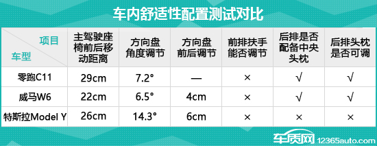 通过测试数据来看,三款车型的主驾驶位座椅可调范围都比较不错,零跑C11和特斯拉Model Y测得的成绩分别为29cm和26cm,威马W6的表现稍逊一筹,不过也达到了22cm,能够满足日常使用。方向盘部分,特斯拉Model Y的角度调节达到14.3°,前后可调距离为6cm,相较另外两款车型优势明显。威马W6的方向盘可调节角度为6.5°,前后距离为4cm。零跑C11由于试驾车本身的特殊原因,因此未能测得方向盘前后可调节距离。总体看来,三款车型在车内舒适性配置环节表现平平,没有什么惊喜的亮点,槽点也谈不上,算是无功无过。当然,三款车型的前排中央扶手均采用不可调节的固定式设计,舒适性表现一般,这点确实比较令人遗憾。