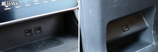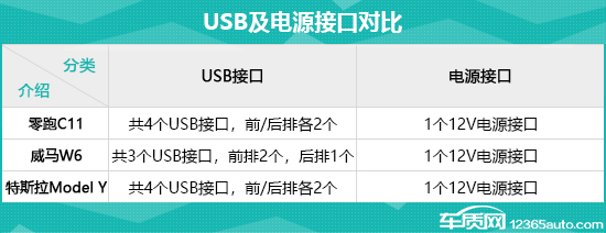 充电接口方面,三款车型的表现各不相同。其中,零跑C11在前排储物格内配备2个USB Type-C接口和1个12V电源,后排空调出风口下方配有2个USB接口,经过测试,后排USB接口电压均为5.06V,电流为1.02A;威马W6前排2个USB接口位于中控台下方手机无线充电板内,后排USB接口位于后排空调出风口下方。经测试,前排USB接口电压电流为4.98V和1.22A,后排为5.06V和1.54A,相比较而言,后排USB接口的充电效率更高;特斯拉Model Y在前/后排各配有2个Type-C接口,鉴于Type-C接口的普及程度目前并不高,因此还是传统的USB Type-A接口更为实用。