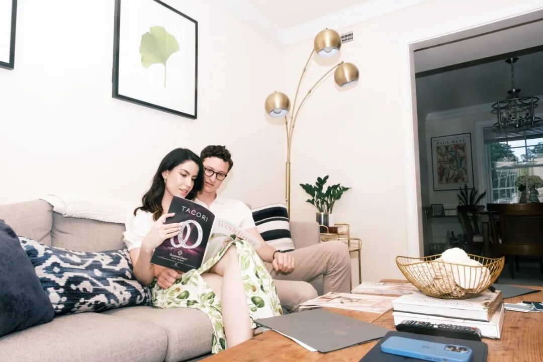 玛丽亚·文尼科夫和马克斯·道奇在弗吉尼亚州里士满的公寓里翻阅婚礼杂志,为10月份的婚礼做准备