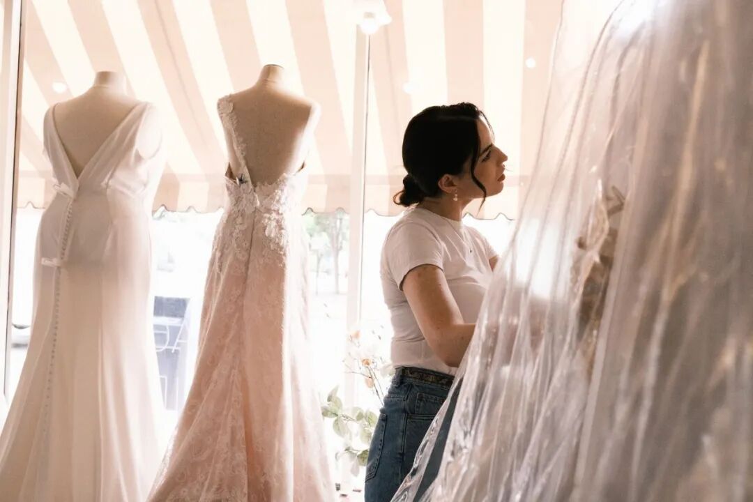 玛丽亚·文尼科夫在弗吉尼亚州里士满的Blue Sage Bridal店里挑选婚纱
