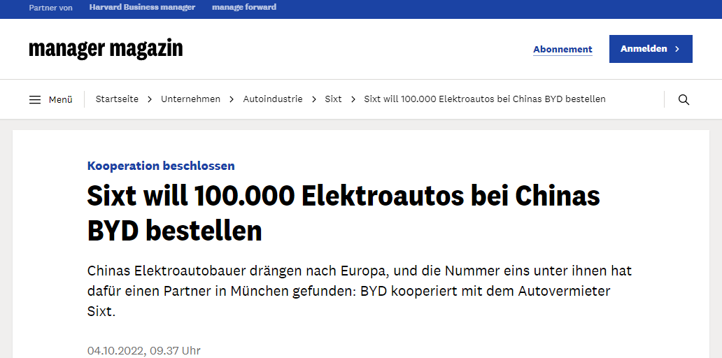 中国电动汽车制造商正在向欧洲市场阔步前进,而头号企业已经率先找到了慕尼黑的合作伙伴。比亚迪正与席克斯特汽车(Sixt)租赁公司开展合作。德国《经理人杂志》相关报道全文现编译如下:
