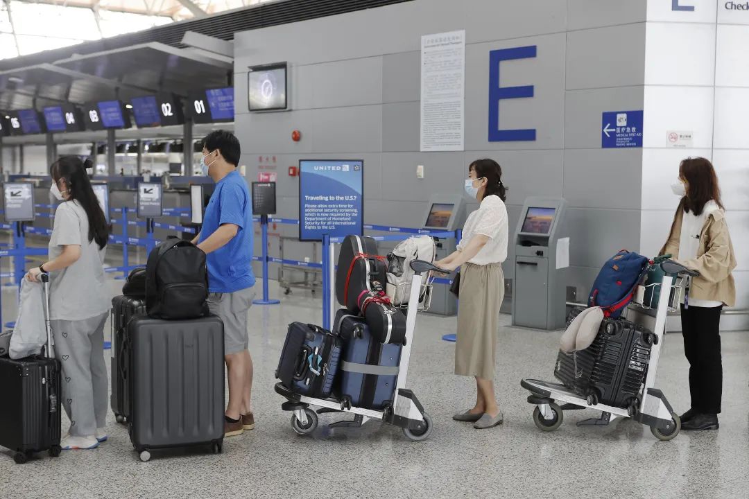 2021年8月19日,大批留学生与家长在浦东机场航站楼内有序排队,等待办理登机手续。(@视觉中国 图)
