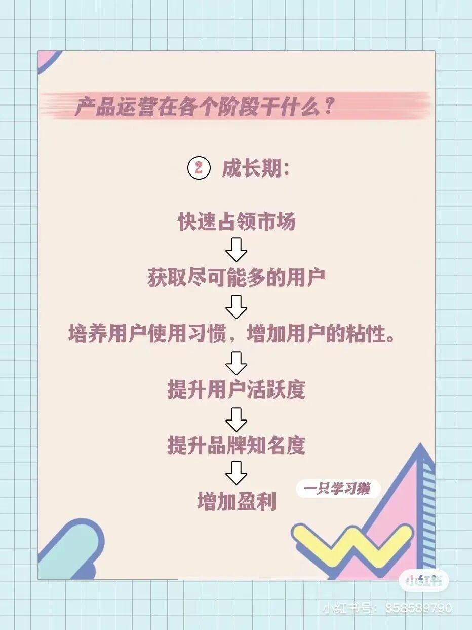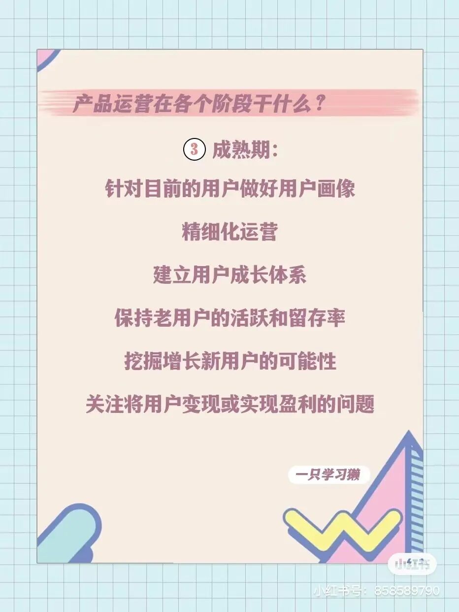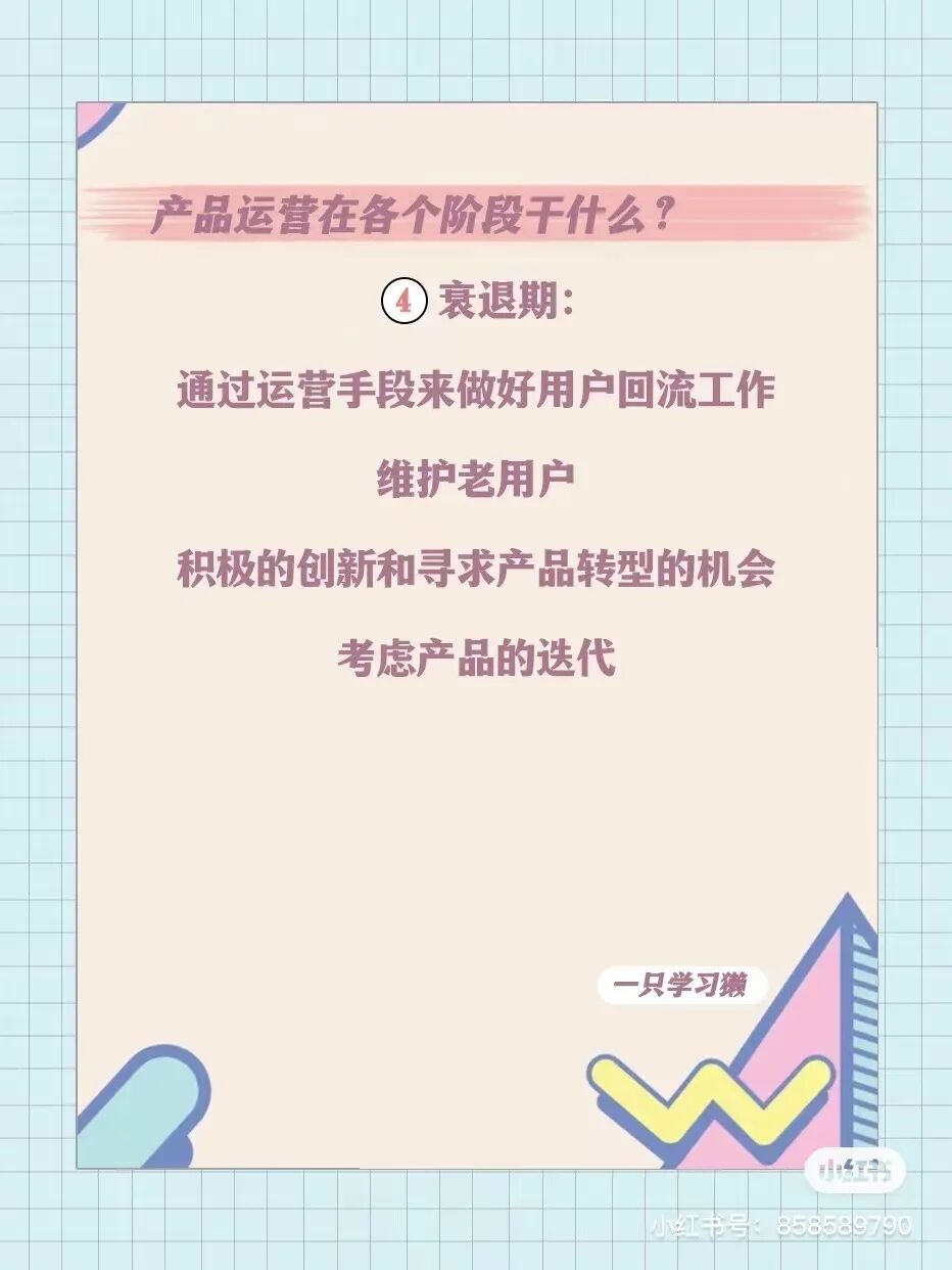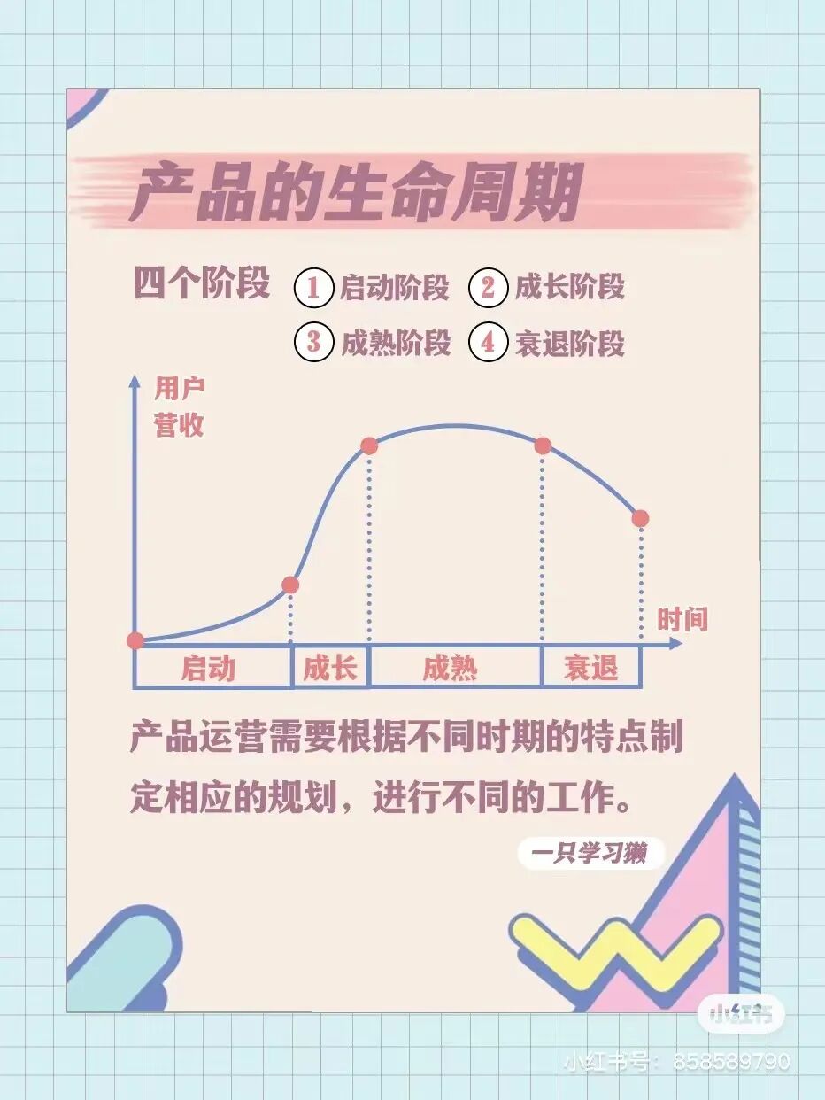 要做好产品运营的工作,首先你需要了解,大部分的互联网产品,都是有生命周期的,分为四个周期,我们可以参考小红书用户@一只学习獭分享的生命周期图。