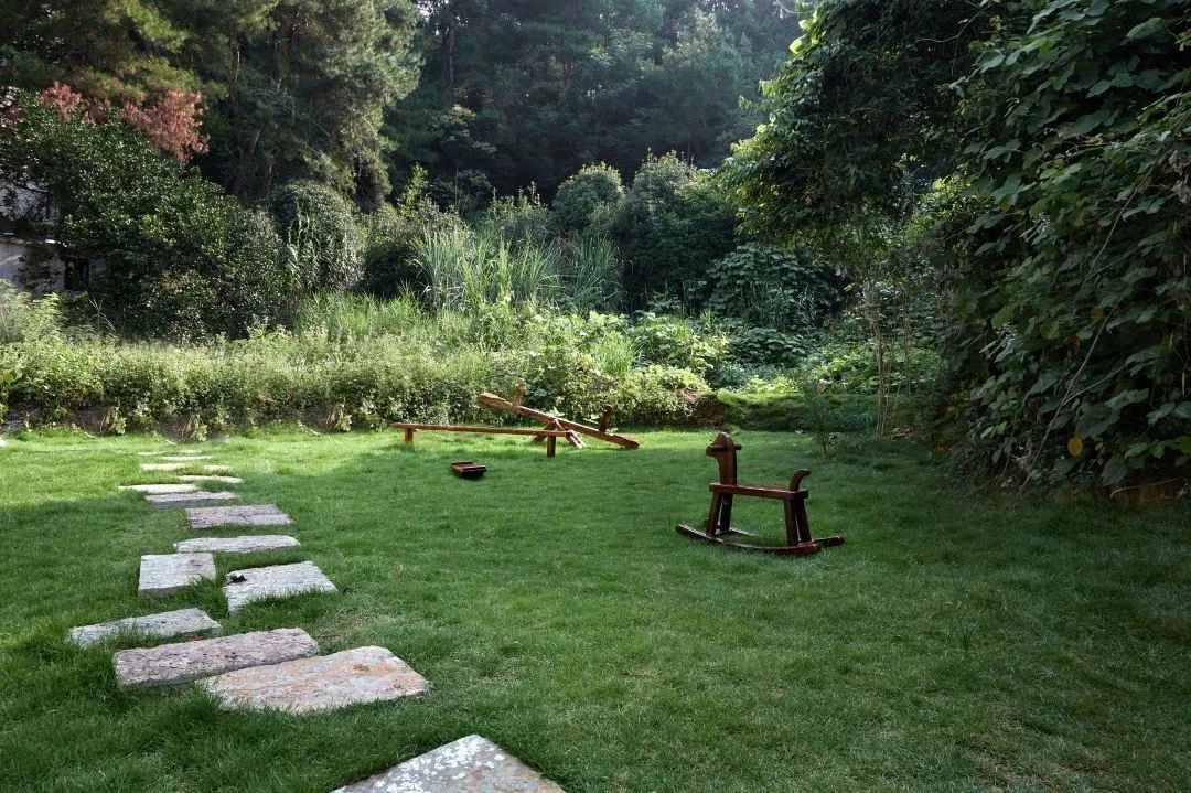酒店后院还有一个小朋友的迷你乐园,木质的小木马、跷跷板和树桩做的小路,大人可以在屋子里喝下午茶,小孩在外面玩耍,各自欢喜,带娃也可以好好度假。