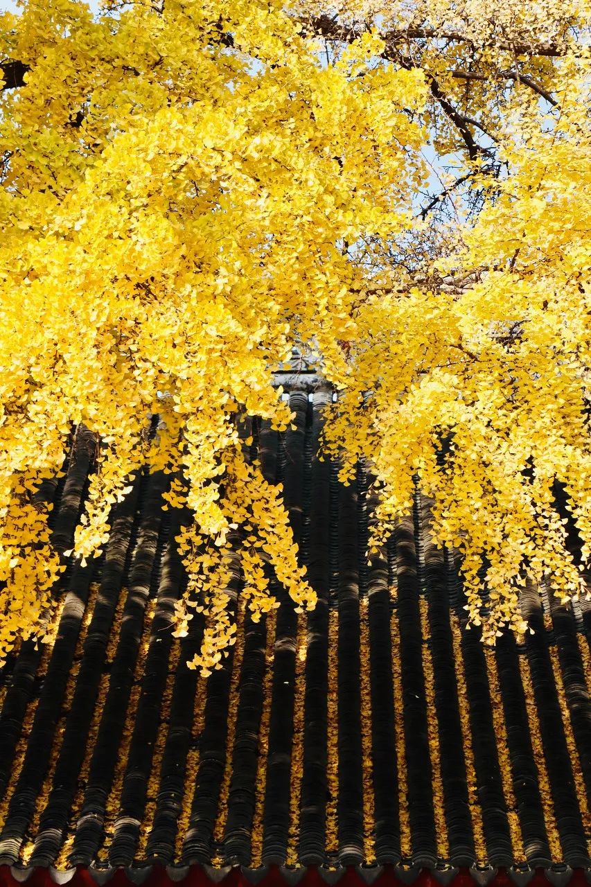 走到深秋,定慧寺殿前的两株百年银杏并峙,一片金黄,洒落一地,一眼便难忘。