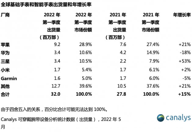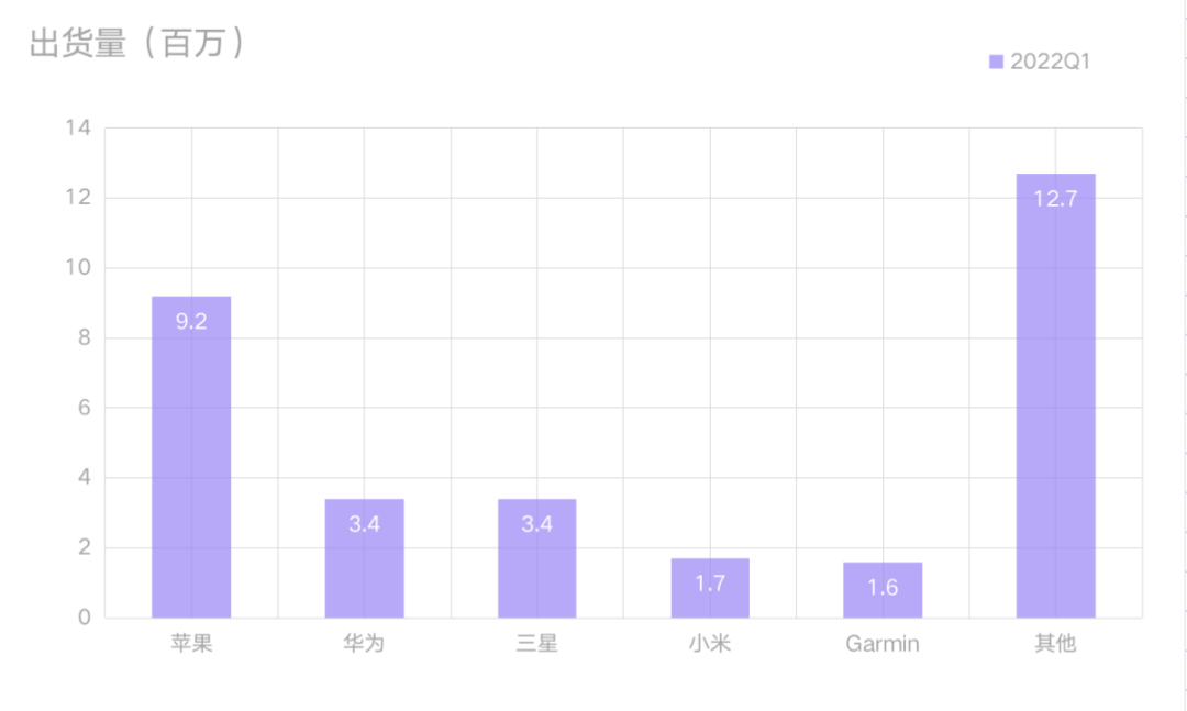 此外在近日研究机构Counterpoint Research发布了2022年Q1全球智能手表市场报告。根据报告2022年Q1全球智能手表市场的出货量同比增加了13%,但由于季节性需求疲软,环比下降了24%。
