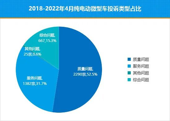据车质网统计,2018年-2022年4月期间,微型纯电动车的单纯质量问题投诉占比超过了五成,其中“动力电池故障”和“充电故障”是投诉最为集中的两类故障问题,在同期质量问题投诉总量中的占比分别达到了21%和11.4%。作为纯电动车型,这两类故障问题直接影响到了用户的日常使用,引发不少车主的不满。反观微型纯电动车的服务问题,投诉量同样出现逐年递增的趋势,投诉总量已突破千宗,其中车主抱怨大多集中售前服务中,如“提不到车”和“变相收费”,多与车辆购买有关,侧面也反映出相关企业在处理车主诉求时重视程度和应对策略还有待提升。