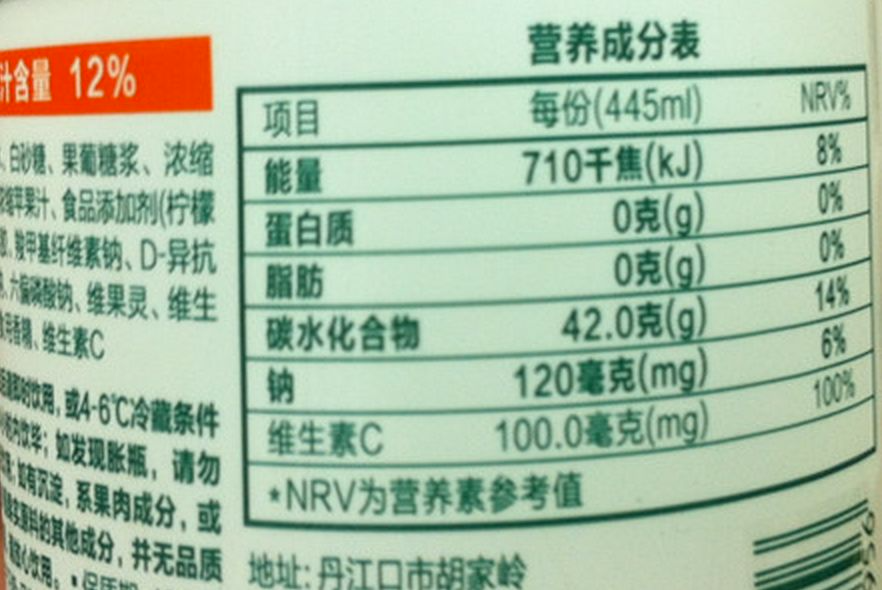 但是呢,不幸的是,好奇实验室的实验员去测了一下发现这汤里根·本·木·有·维·生·素· C …… 「把新鲜菠菜叶、菠菜汤里的菜叶和『芙蓉荟蔬汤』里挑出来的菜叶,三个样本,送到杭州市质量技术监督检测院进行维生素 C 的检测。 检测结果让人大吃一惊! 新鲜菠菜 维 C 含量:142.37mg / 100g 菠菜汤菜叶 维 C 含量:47.03mg / 100g 芙蓉荟蔬汤菜叶 维 C 含量:0 !」 这类食物从健康变成不健康的原因,除了第四个是由于开封菜用的脱水蔬菜加工技术可能破坏了蔬菜里面的维生素外,其他大多都是健康的食物掺杂着不健康的食材被我们不知不觉吃下去。 所以为了避免掉坑,请跟我一起念:营养成分表大法好!配料表大法好! 营养成分表大法依照我国的《预包装食品营养标签通则》( GB28050-2011 ): 凡是标注营养成分表的,都需要标注能量、蛋白质、脂肪、碳水化合物、钠这五类成分的含量,而且必要的时候还需要标注糖的含量。 而常见的被我们作为可以吃的食物来看待的东西里,我们需要关心的基本上只有以下几类不用标注营养成分表: ——生鲜食品,如包装的生肉、生鱼、生蔬菜和水果、禽蛋等; ——乙醇含量≥ 0.5% 的饮料酒类; ——现制现售的食品; 这意味着,只要是买吃的,只要有预先包好的包装,基本上都有营养成分表。 对着营养成分表看百分比,最粗暴直接的办法就是: 通常情况下,脂肪、钠、糖(标在碳水化合物下属的那个「糖」)越高越不好。 如果【每一份】中某一项营养素旁边标的数字超过 33% ,代表超过一餐的限量;超过 100% ,代表超过一天的限量。 【每一份】的量,需要用这份食物在包装上标的重量与包装上营养成分表标出的每 100g 的含量进行推算,如可乐中含糖量为 11.7g/100ml ,则 600ml 可乐中含糖为 600ml*11.7g / 100ml = 11.7g*6 = 70.2g 。 现在我们再来看看 1 号选手的营养成分表: