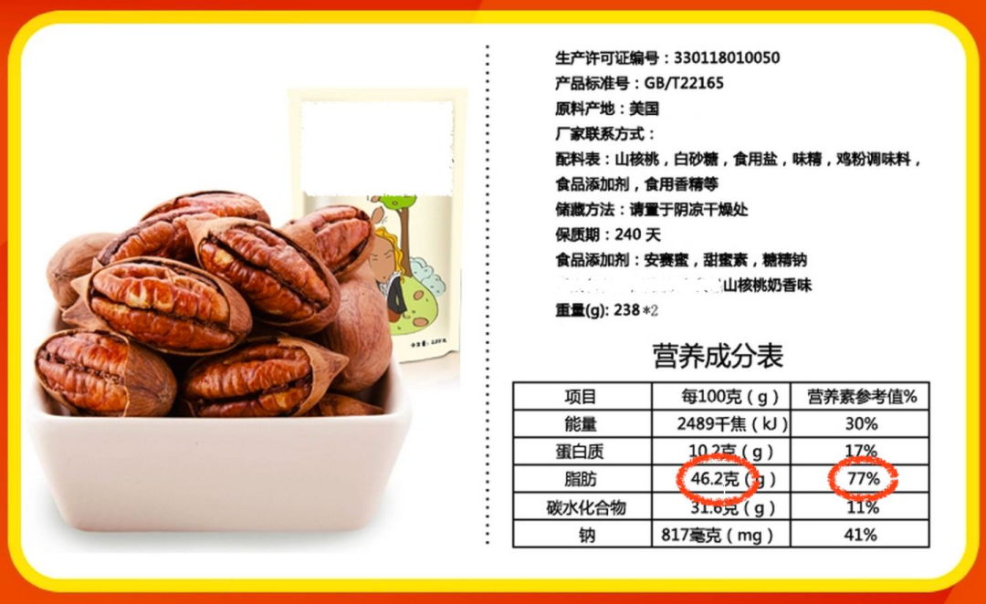 有木有发现,这位选手的技能也是隐藏的脂肪! 虽然坚果含有的脂肪以不饱和脂肪为主,相对蛋黄酱来讲要稍微健康一些,但是它 100g 里面毕竟还是有 46.2g 都是脂肪呀。 这不饱和脂肪毕竟还是脂肪酸,吃多了总归是不健康的。 而且,如果是盐焗味的,那么它的钠含量还会再上一层楼,这又是另外的问题咯! 由于这种处理过的坚果很好吃,大家吃的时候通常可都是不带一点儿节制的,像这种奶油核桃分分钟就是十几个下肚。 而 100g 坚果真的不多,带壳就是十来个的样子。