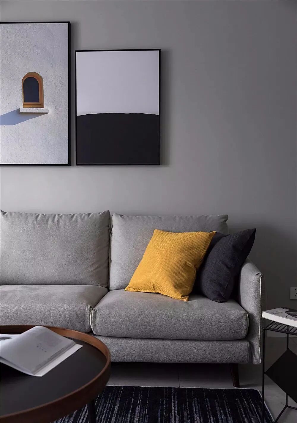 低饱和度的墙面配合同色系的质感沙发,局部采用深色与跳色软装修饰格调。