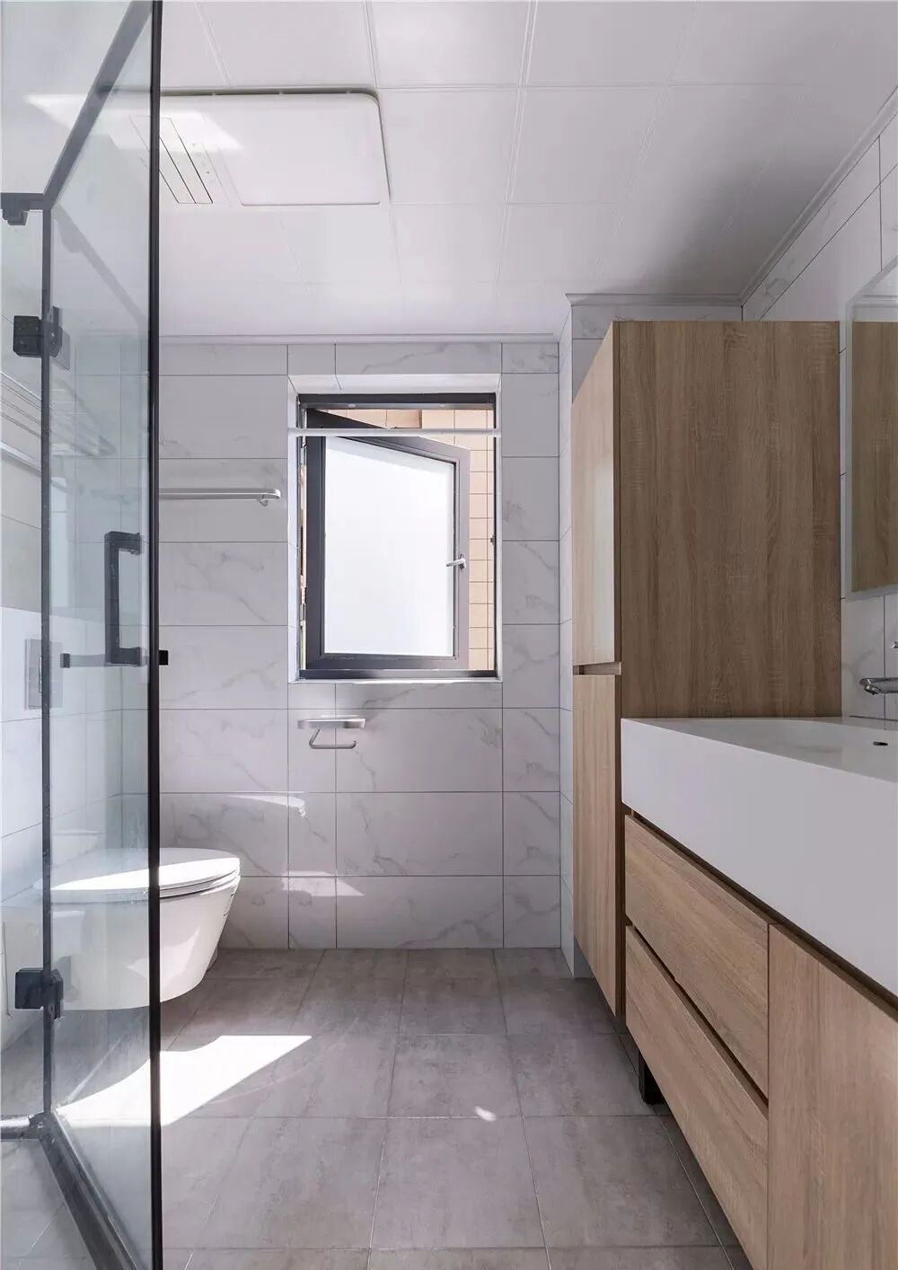 卫生间简洁明亮,在满足正常使用面积基础上加大储物空间,增强功能性,木色浴室柜为冷色空间增加自然温暖的色调。