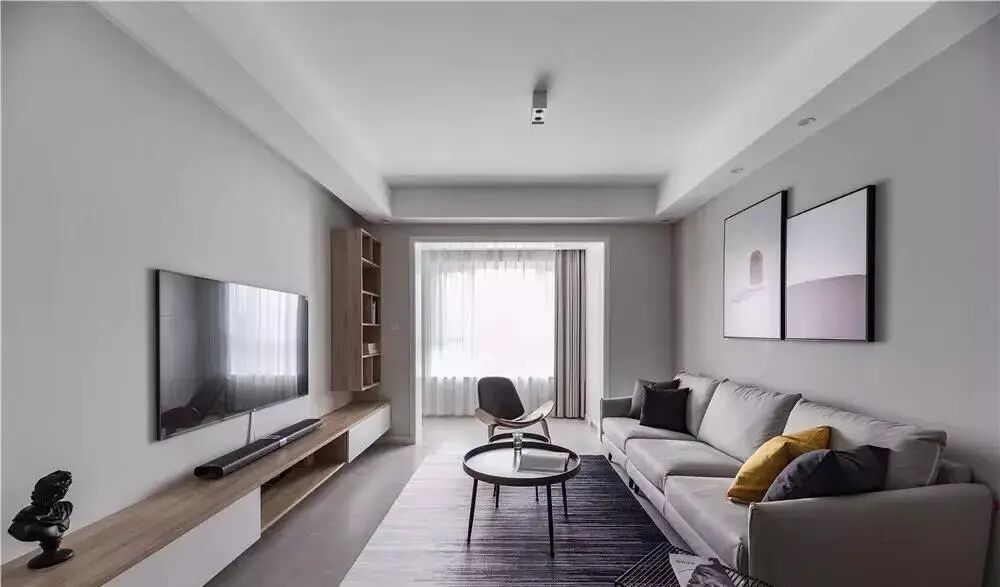 客厅纳入阳台拓展使用空间,良好的采光加上灰白色墙面让室内明亮通透。