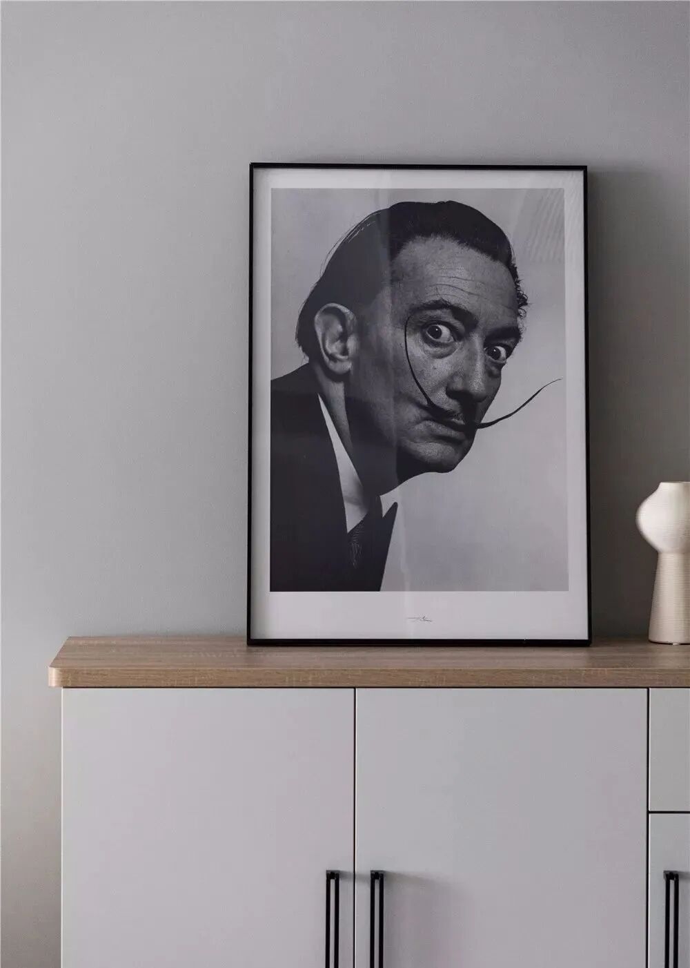 客餐厅走廊端景,成品矮柜增添公领域收纳空间,一幅达利肖像画点缀