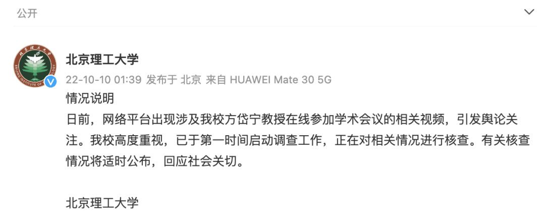 10月10日凌晨,北京理工大学官方微博发布情况说明: