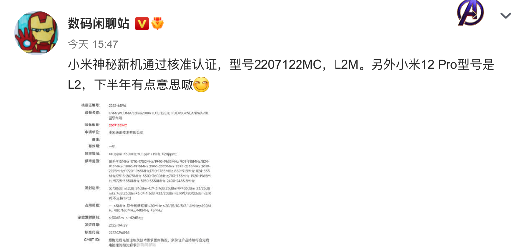 不过,就以往的情况来看,手环新品有可能会与其他产品一同现身发布活动。而最新的消息中也曝光了小米旗下的手机新品。据悉,博主@数码闲聊站 在今天的一份爆料中提到,“小米神秘新机通过核准认证,型号2207122MC,L2M。另外小米12 Pro型号是L2,下半年有点意思嗷”。