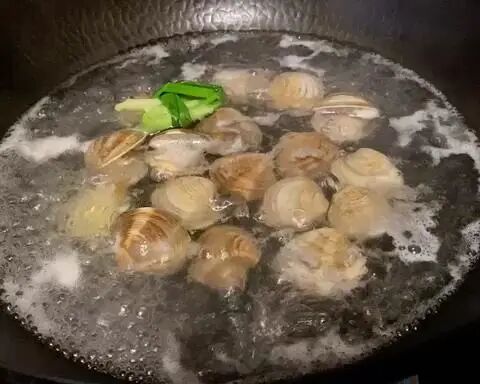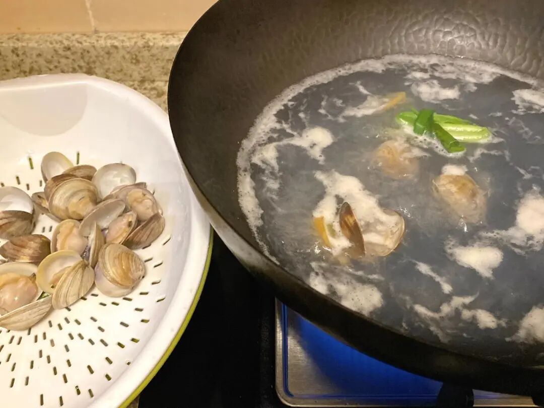 1. 水煮沸后,姜片、葱结连同蛤蜊一起下锅。