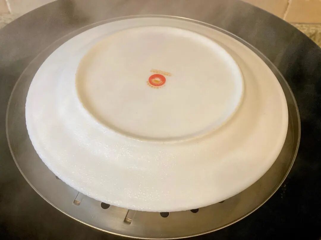 5. 盖上盖子,或用耐高温保鲜膜覆盖,水煮沸后蒸12分钟,焖3分钟(浅盘比深碗更易熟)。