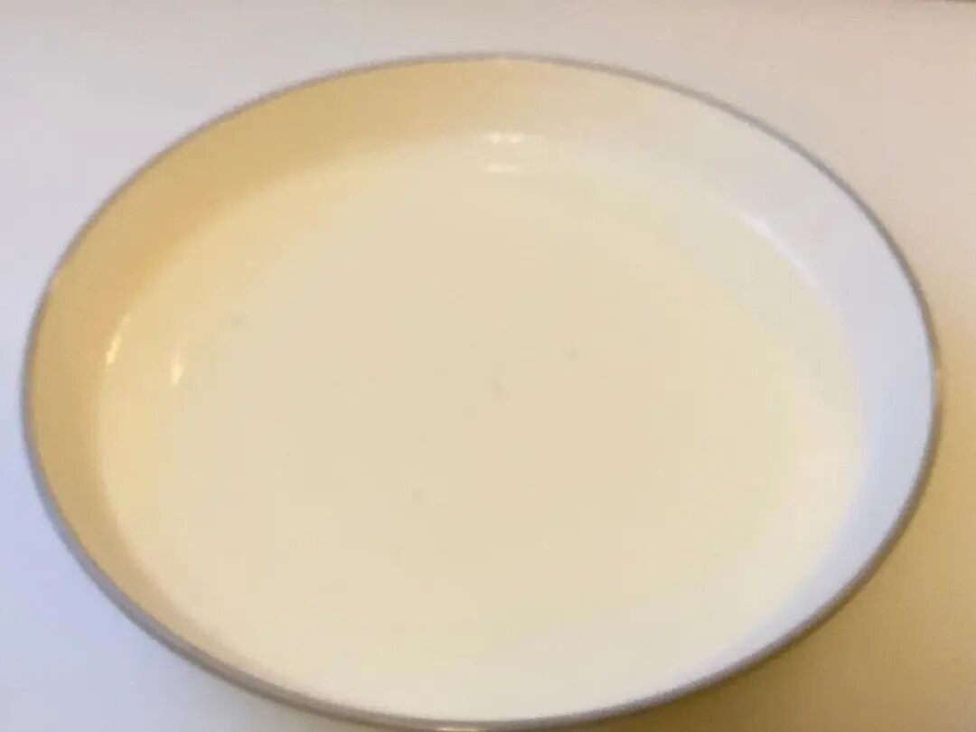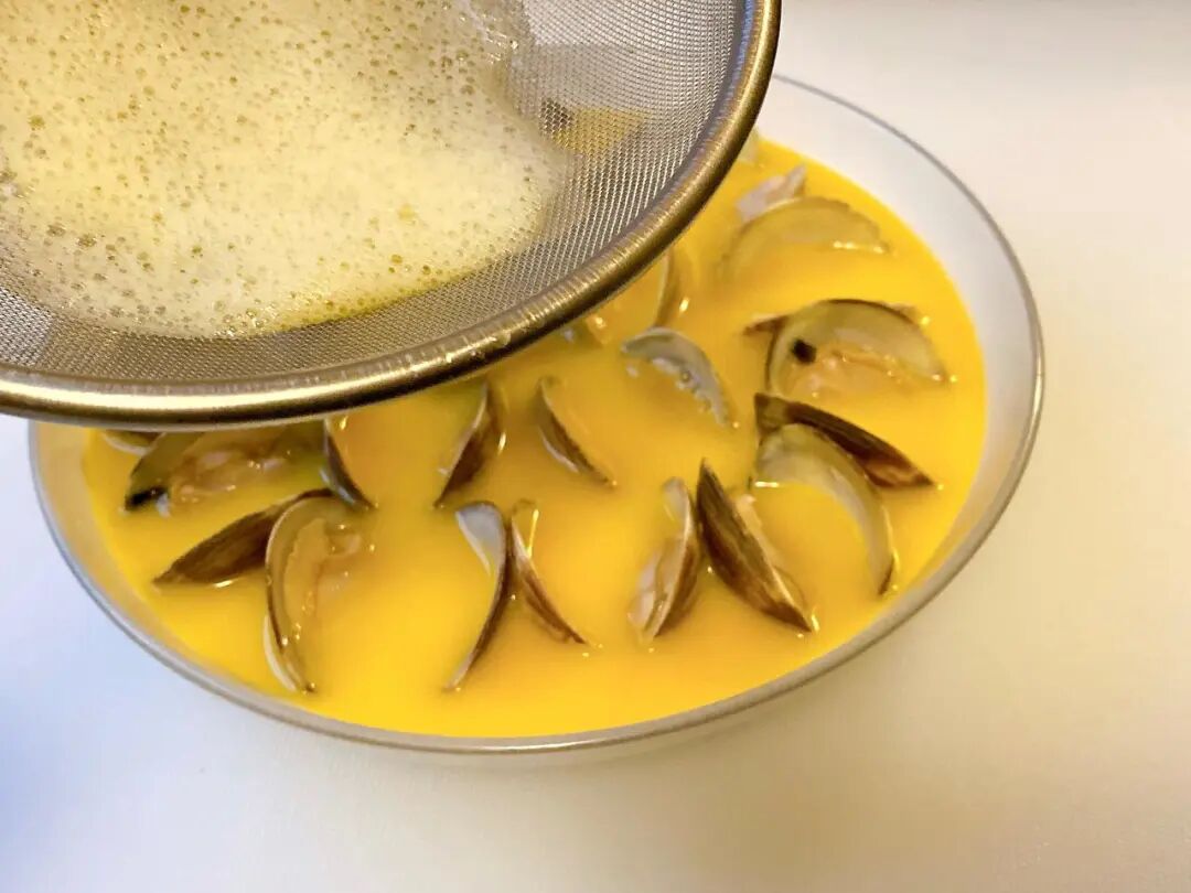 4. 将蛋液过滤加入蛤蜊盘中。过滤可避免气泡进入。