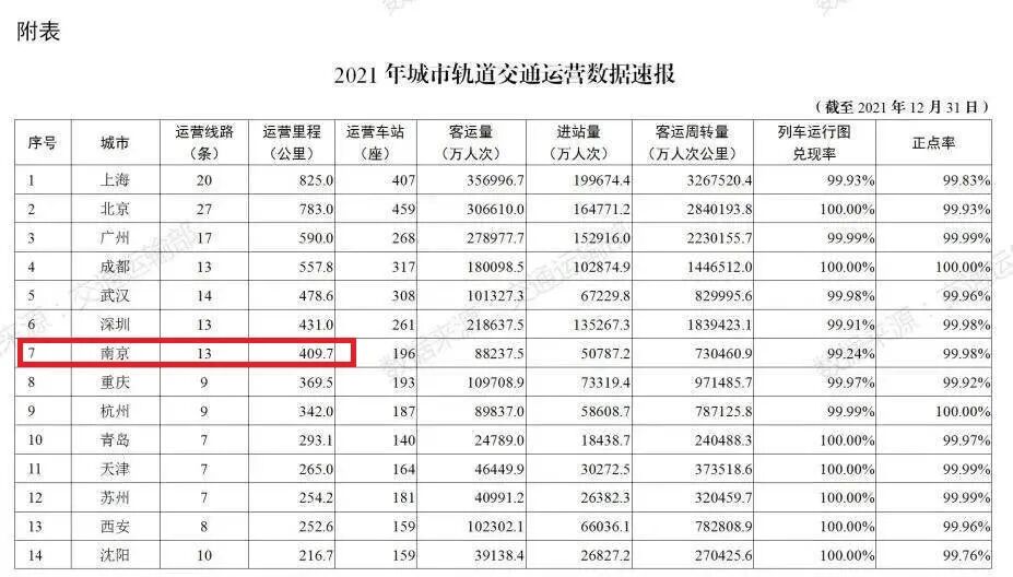 其次,南京最新地铁里程排名全国第7,里程数为409.7公里
