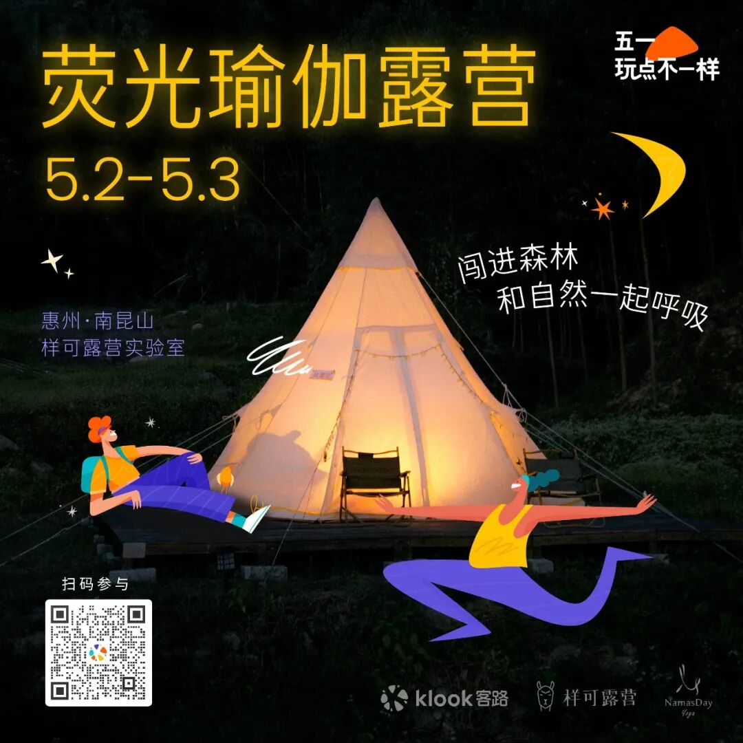 Klook预定样可露营5月2日主题限定·荧光瑜伽露营仅899元/人,即可享受不拥挤的五一假期,逃离喧嚣,将压力值调整为0,重新出发!