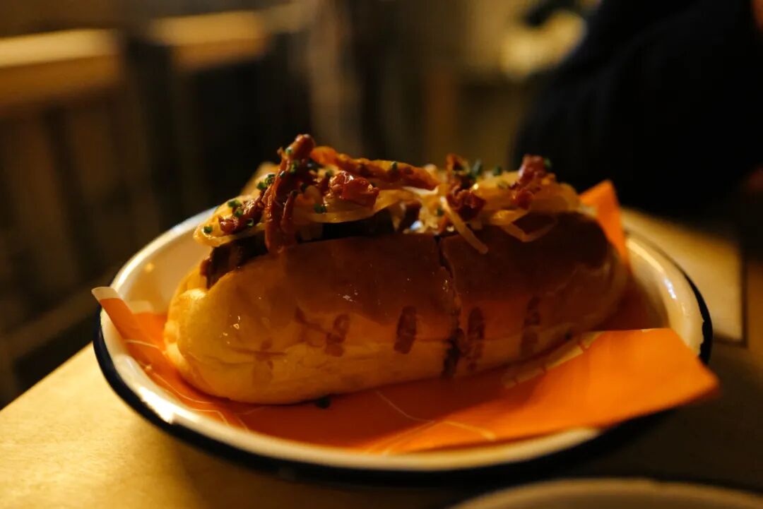 跟预想完全不同的和牛牛舌三明治,本以为是个Katz那种盐水牛肉三明治,结果竟然是个松软的热狗包hhh,咬下去更觉大有乾坤,牛舌不是小酒馆中常见的薄切,而是如墨西哥Taco那样切成块状,慢炖至酥软入味,油脂感与碳水的完美组合,搭配酸爽迷人的腌洋葱与风干番茄,绝赞!