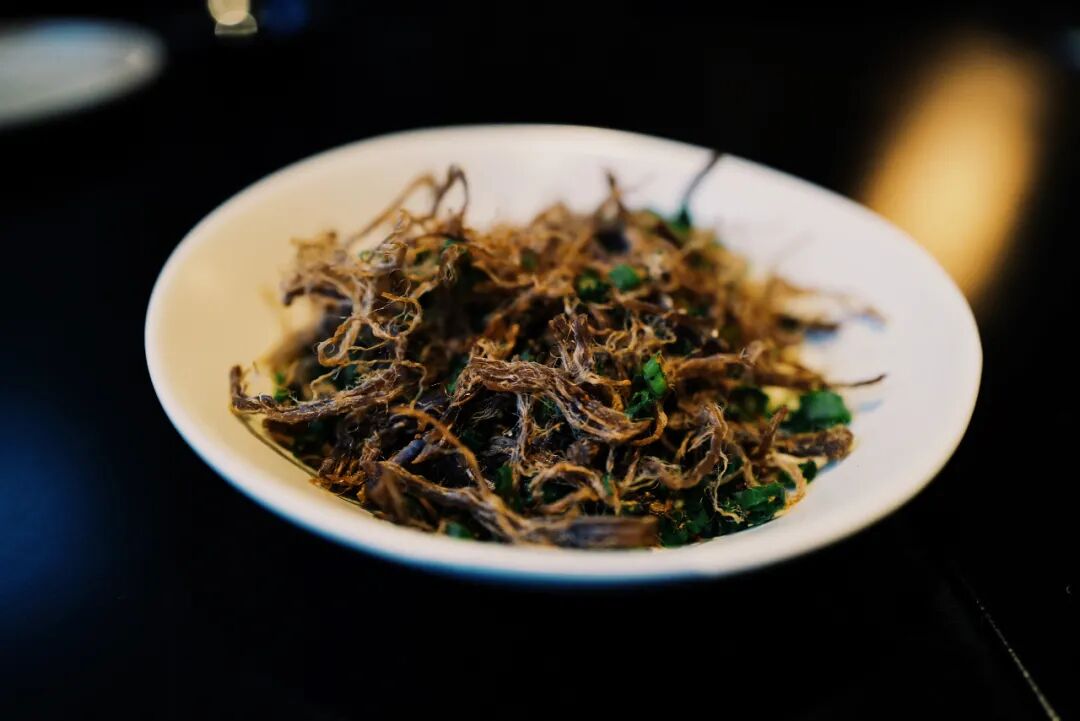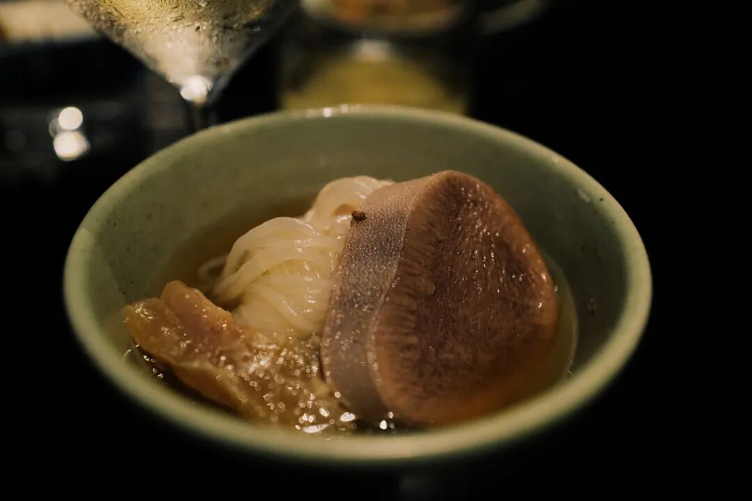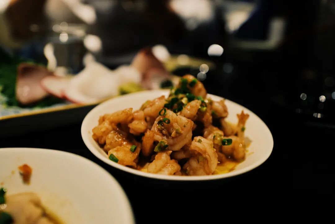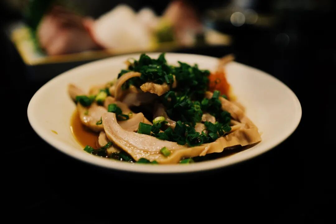 阿华做起下酒小菜的脑洞,绝对没把自己局限在一个日料厨师的设定里。譬如自制的风干牛肉丝,韧劲十足;柚子醋猪肚尖,也是日料店几乎不可能看见的食材;一盘儿炒虾仁博得全场好评、并最早光盘,新鲜虾仁去筋翻炒,半中半西的调味,此时该来一碗面权当浇头下肚。
