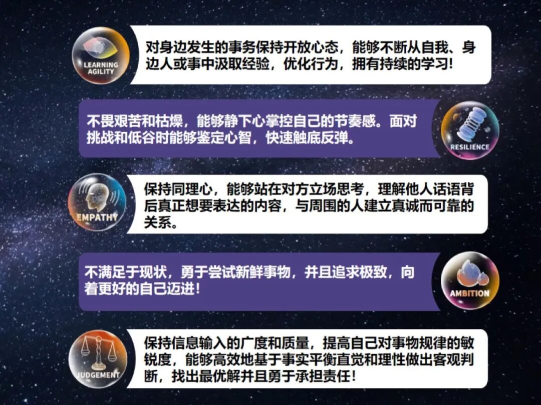 Learning agility:对身边发生的事务保持开放心态,能够不断从自我、身边人或事中汲取经验,优化行为,拥有持续的学习