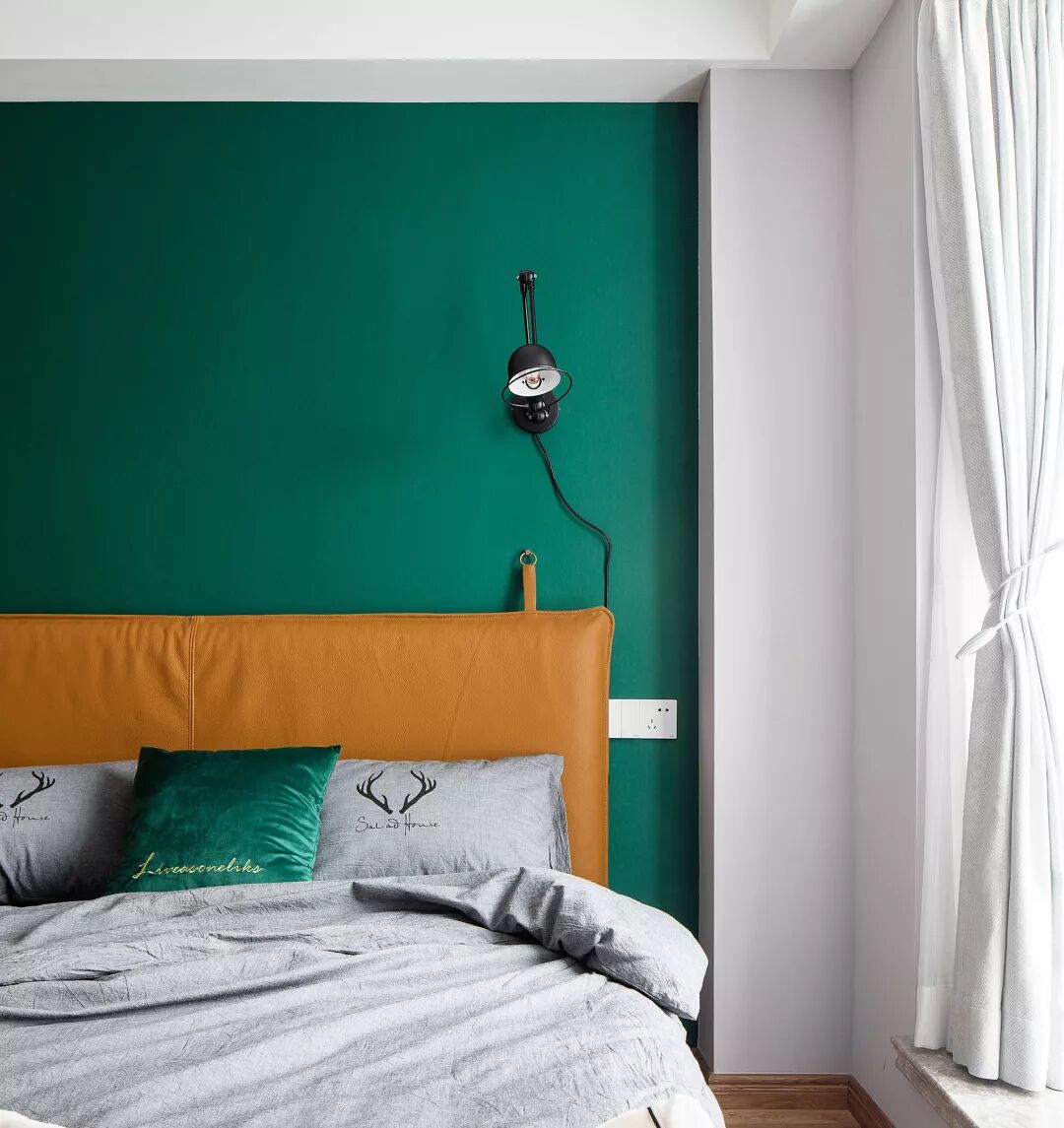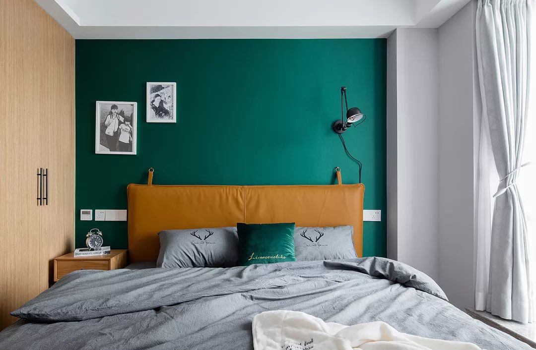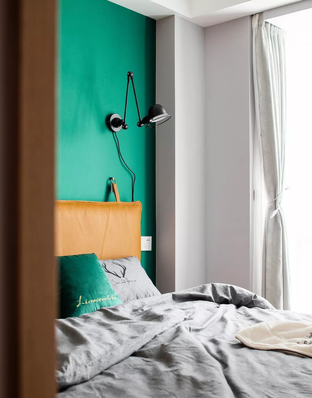 (主卧室)个性的床是一个DIY的成果。从找厂家制作床靠背,找铜扣,找人制作床架,中间的过程既艰难又快乐!给人一种创新独特的感觉。