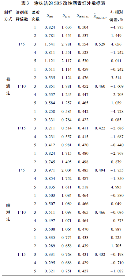 选择能将沥青完全溶解且对红外光谱的背景测量无影响的试剂,一般采用四氯化碳溶液。选用ATR法所对应的同一样品,分别采用稀释倍数5倍,10倍,15倍的沥青溶液,选用悬滴法和喷淋法两种方式,检测待测样品。悬滴法是将待测样品用滴管或液枪取一滴滴于观测窗片上。喷淋法是将滴管(5ml)与窗片顶面呈钝角,用快速挤压滴管的方式,使沥青溶液快速的从窗体顶面至底面形成一层均匀的沥青薄膜。用两种方式检测结果如表3所示。