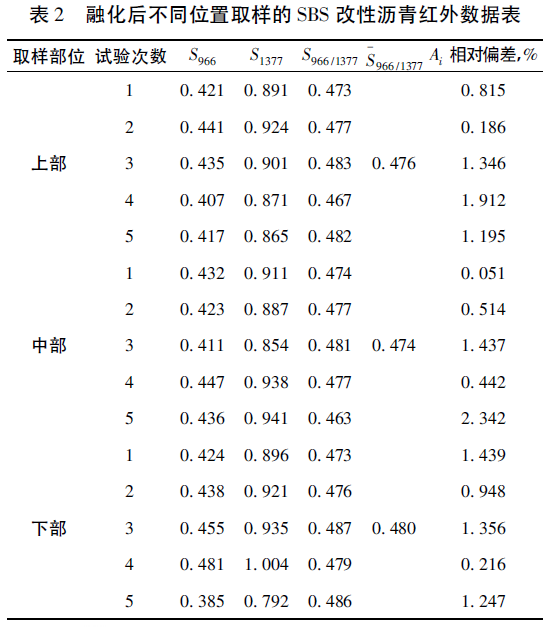 SBS含量检测的准确性很大程度上依赖取样的是否具有代表性。就ATR法来说,目前采用比较广泛的是固态取样。目前,山东省检测机构的红外试验使用的主要仪器为布鲁克公司生产的TENSORⅡ傅里叶变换红外光谱仪,其ATR附件均是单次反射晶体。单次反射ATR附件,观测角固定,光源每次折射的点固定,这就存在被检样品如果不具有代表性,其检测结果就失实。对同一的样品,用固态取样分别从样品上、中、下部其检测结果如表1所示。