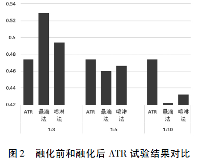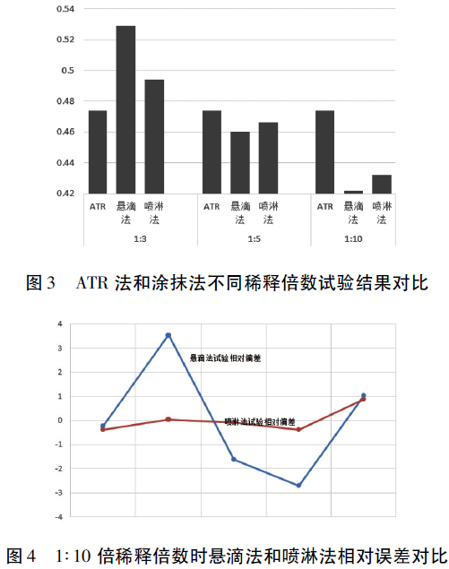 从图3可以看出,稀释5倍的沥青溶液浓度过高,造成其检测结果偏高,与ATR法测定的结果没有可比性,而稀释15倍的沥青溶液浓度偏低,造成其测定的结果偏低,综上选择稀释10倍时较为准确。再者,悬滴法和喷淋法,就稳定性而言,喷淋法测得的数据更为稳定,在稀释10倍时,随着试验次数的增加,试验结果变化微小如图4所示,可以确定,采用喷淋法在稀释10倍时,试验次数可以减少为1次,这就使得检测更加迅速。