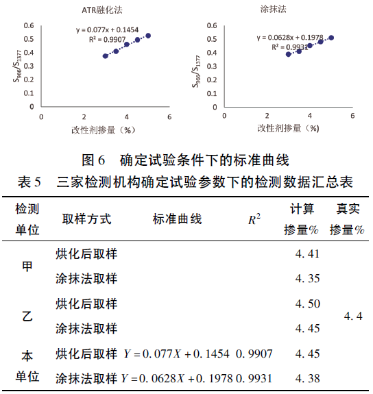 对济青改扩建同一标准样品和待检样品,三家单位确定同一试验条件,涂抹法:采用喷淋法,1∶10倍稀释,ATR法采用融化热状态取样,重新制作标准曲线,其检测结果如表5所示,本单位标准曲线如图6所示。