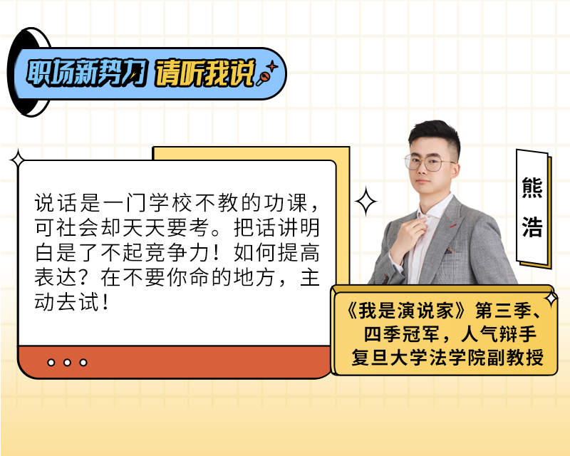其中,外向且善于表达,就常常是“职场赢家”的共同特征。《我是演说家》第三季、四季冠军,人气辩手,复旦大学法学院副教授熊浩就曾指出: