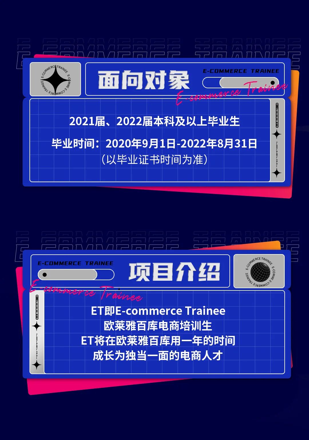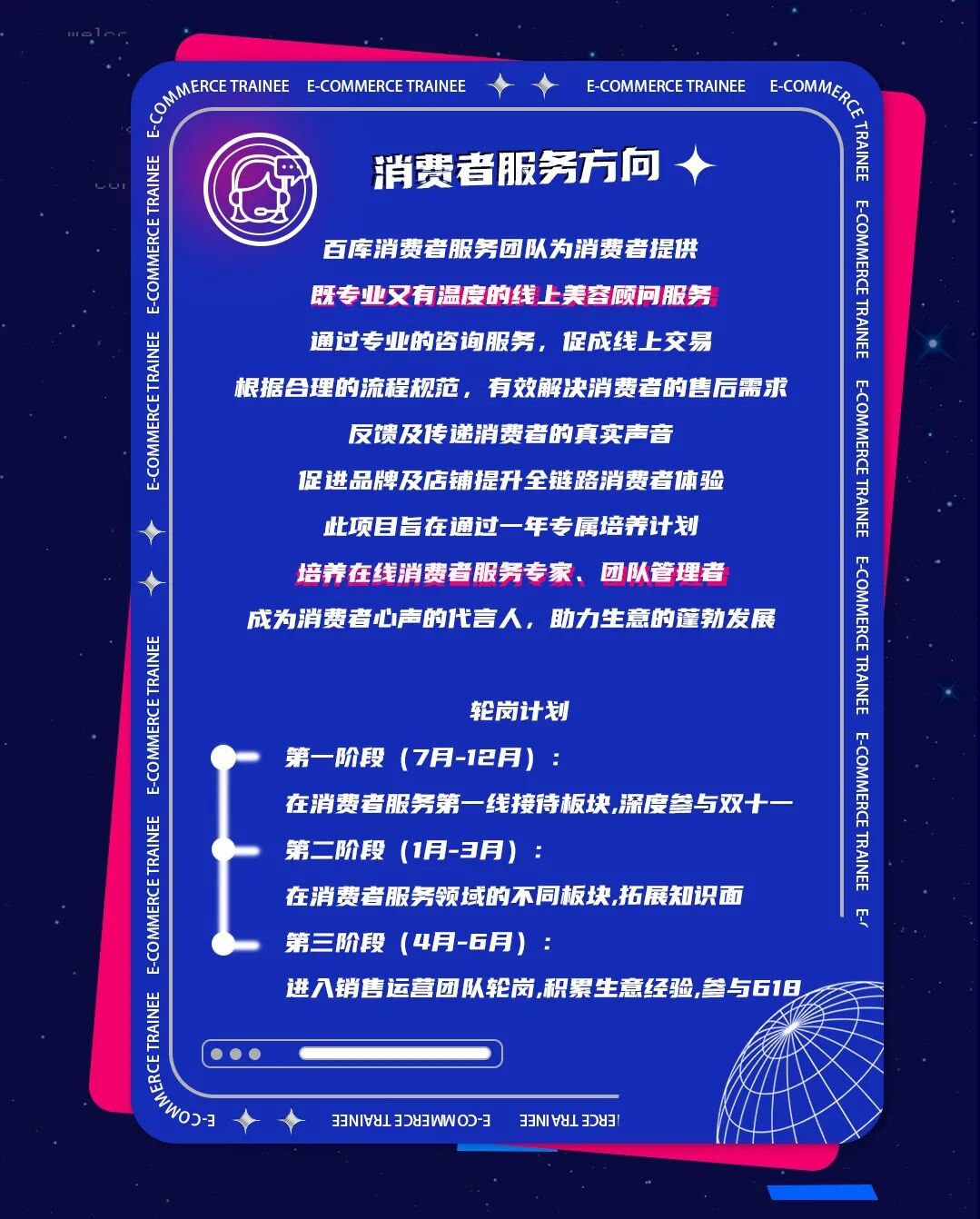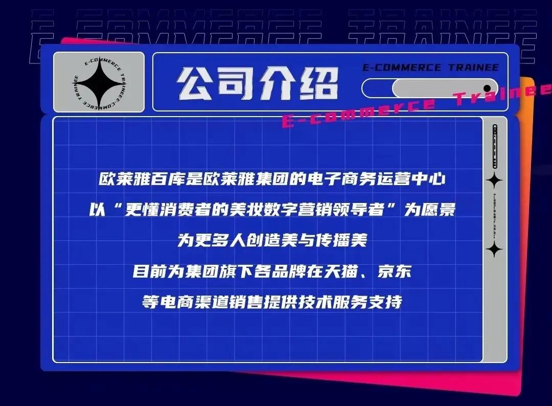 欧莱雅百库2022届电商培训生来啦 欧莱雅百库每年都会通过“电商培训生项目”为欧莱雅的电商人才梯队添砖加瓦,为电商业务的持续成功打造人才基石。现在主要招聘的是消费者服务方向的电商培训生,通过专业的咨询服务,促成线上交易,根绝合理的流程规范,有效解决消费者的售后需求,反馈及传递消费者的真实声音,促进品牌及店铺提升全链路消费者体验。