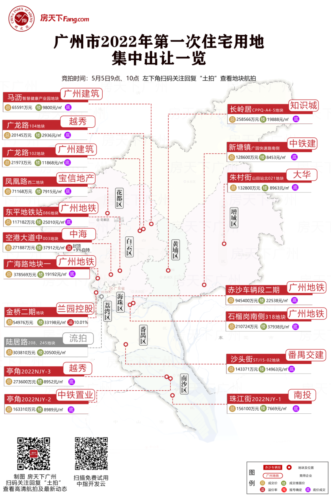 从竞拍结果看,此轮土拍仍是“国家队”为主,拿到地的民企只有2家。 其中,广州地铁集团拿地最多,豪掷165亿元,横扫海珠和白云共4宗地块: