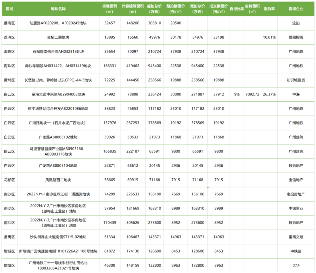 a.海珠赤沙车辆段AH031422、419地块,以945400万元成交,折合楼面价22538元/㎡;