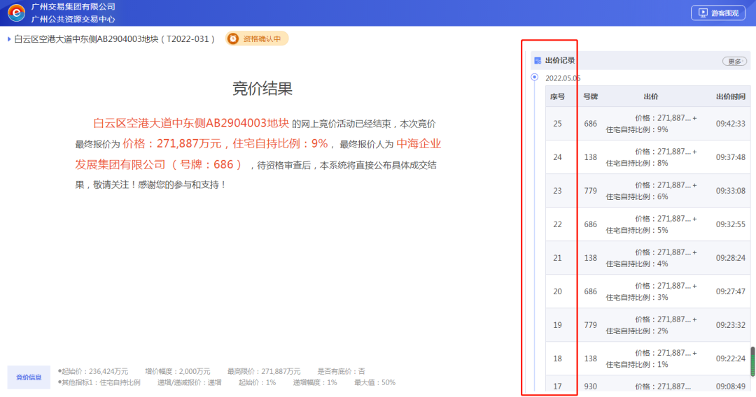一直到5月5号上午,10家房企在激战后,最终被中海以27.2亿元+住宅自持比例9%拿下该地块,成交楼面价34500元/㎡,溢价率15%。