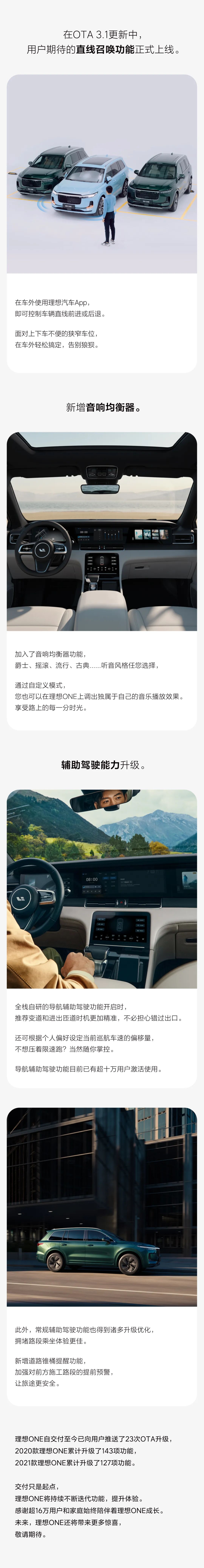 辅助驾驶能力升级 理想ONE即将推送OTA 3.1 发布时间:2022-07-05 08:26:21 理想汽车 本文介绍了辅助驾驶能力升级 理想ONE即将推送OTA 3.1,对大家解决问题具有一定的参考价值,需要的朋友们下面随着小编来一起学习吧! 这篇关于辅助驾驶能力升级 理想ONE即将推送OTA 3.1的文章就介绍到这了,希望我们推荐的答案对大家有所帮助,也希望大家多多支持!