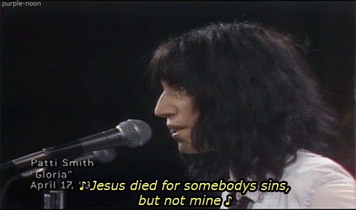 于是,在早期的演出中,帕蒂·史密斯是以配乐诗朗诵的形式表演的,对她来讲,诗歌的意义大于音乐。 她用分期付款的方式购买了一把马丁吉他,为地下实验戏剧写作配乐诗歌。同时,她还给摇滚杂志写稿,换取微薄的酬劳。 但这些为金钱的写作让史密斯迷茫,她已然找不到文字带给她最初的激情。就在此时,史密斯的艺术家朋友们承诺要给她办一场诗歌朗诵会,让她从艺术困境中走出来。 “耶稣是为别人的罪而死,不是我的。”当史密斯诵读出《誓言》惊世骇俗的开头,这场朗诵会便注定不同凡响。