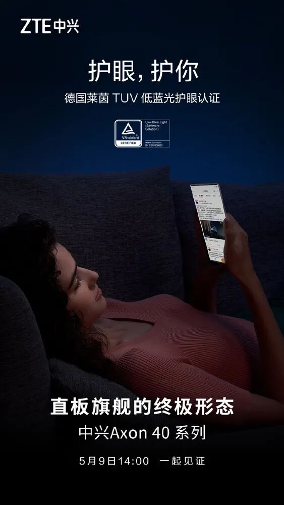 同时,在今天最新的预热中,中兴还表示,中兴Axon40系列的屏幕将支持1440Hz高频PWM调光,4096级自动亮度调节,还获得了德国莱茵TUV低蓝光护眼认证。