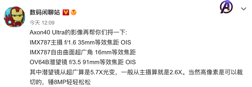 按照爆料中说法,全新的中兴Axon40 Ultra将配备一颗IMX787主摄,f/1.6光圈,35mm等效焦距,支持OIS光学防抖;一颗IMX787自由曲面超广角镜头,16mm等效焦距;一颗OV64B潜望镜,f/3.5光圈,91mm等效焦距,支持OIS光学防抖。其中,潜望镜从超广算是5.7X光变,一般从主摄算就是2.6X。