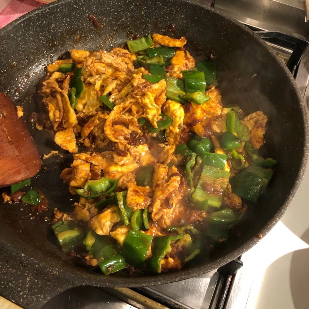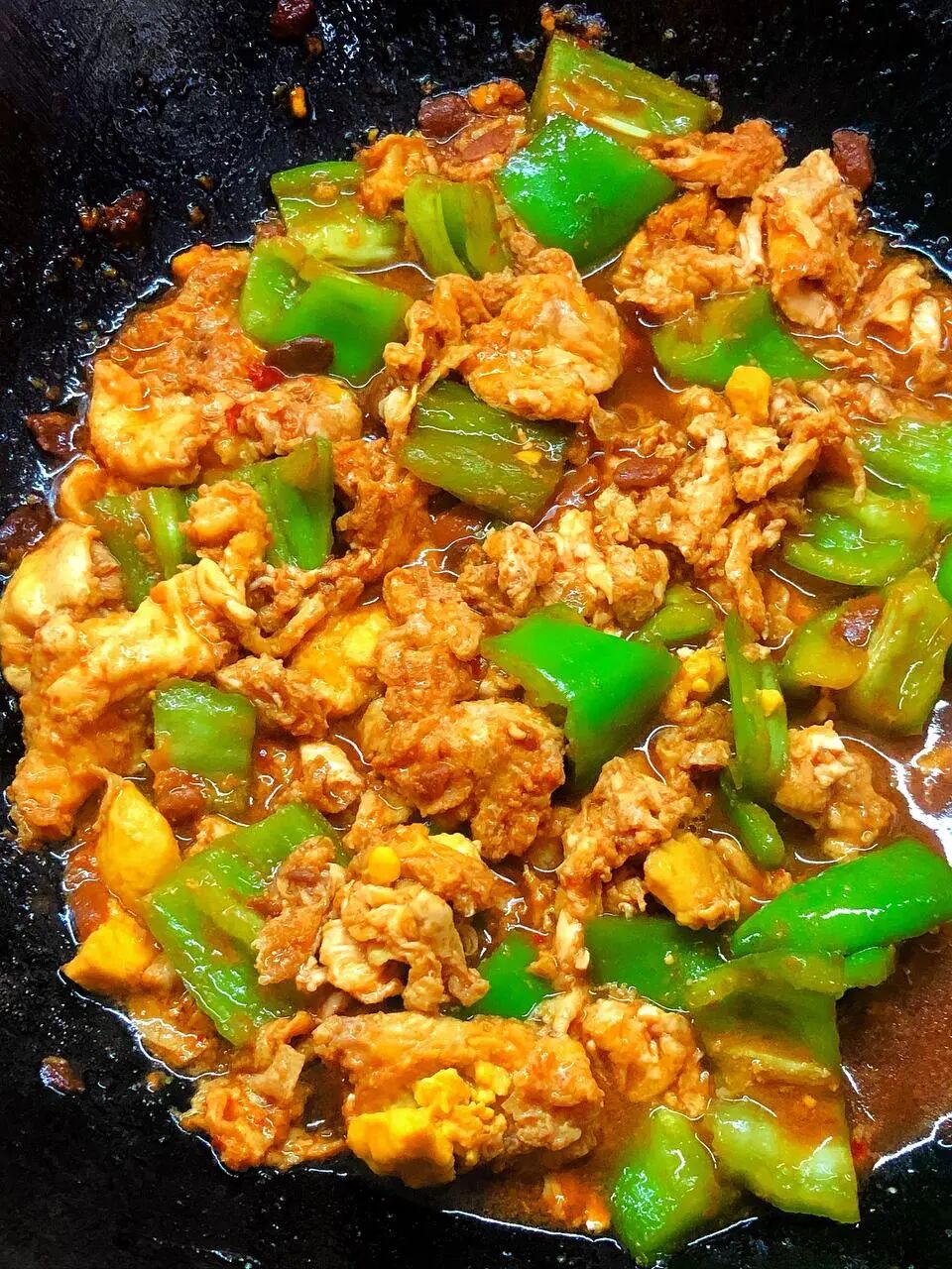 4. 再倒入切小块的青椒,炒断生,最后大火收汁至浓稠就好啦。