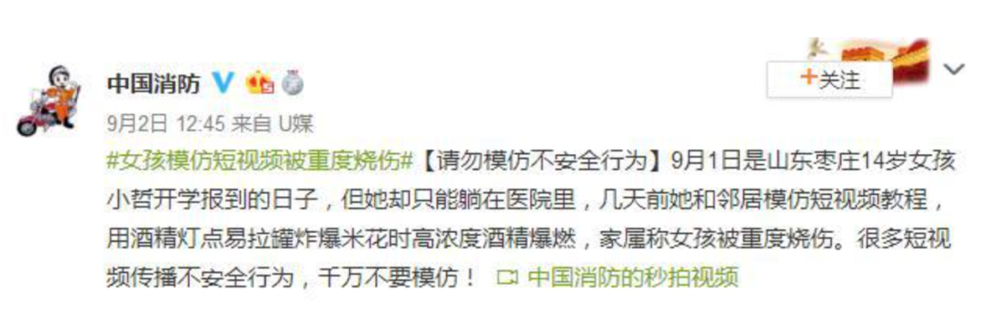 2019年,曾有另外一个美食博主的视频引起过风波。两个女孩在家模仿某网红博主的视频,用易拉罐自制爆米花,结果导致烧伤,其中一位伤情严重,不幸离世。