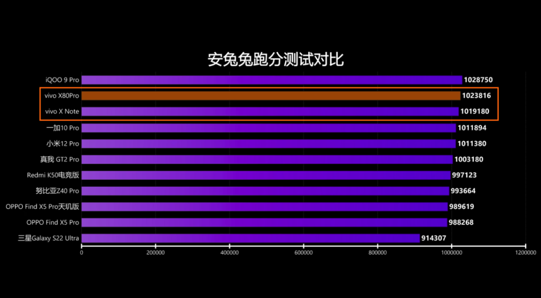 至于喜欢全方位旗舰体验的用户,本月的vivo旗舰迭代X80系列和大屏旗舰X Note也都是可选产品。vivo X Note搭载骁龙8,vivo X80系列则提供骁龙8和天玑9000双版本。两款机型的骁龙8版本安兔兔跑分接近,vivo X80 Pro略高一些。